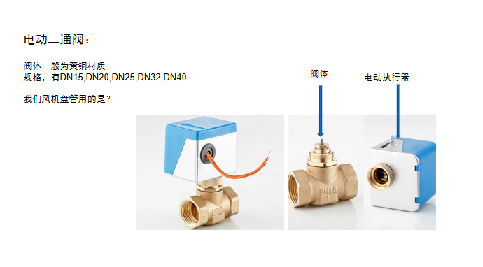 電動(dòng)二通閥的作用,根據(jù)負(fù)荷控制溫度,如果夏季室溫低于設(shè)定值時(shí),通過(guò)電動(dòng)閥調(diào)節(jié)或關(guān)斷來(lái)調(diào)節(jié)水量,另外,電動(dòng)閥與風(fēng)機(jī)盤管的風(fēng)機(jī)電源連鎖,當(dāng)風(fēng)機(jī)盤管停止使用時(shí),電動(dòng)閥隨之關(guān)閉停止供水。