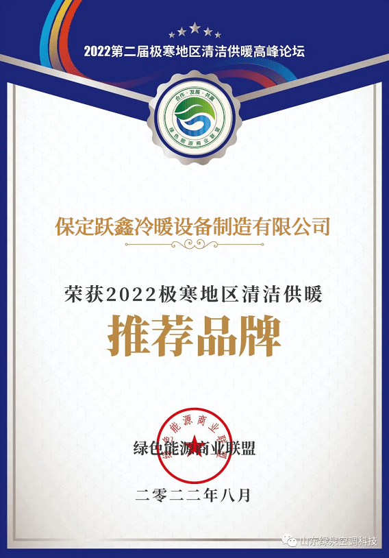 保定躍鑫冷暖斬獲,2022第二屆極寒地區(qū)清潔供暖高峰論壇,優(yōu)秀推薦品牌。