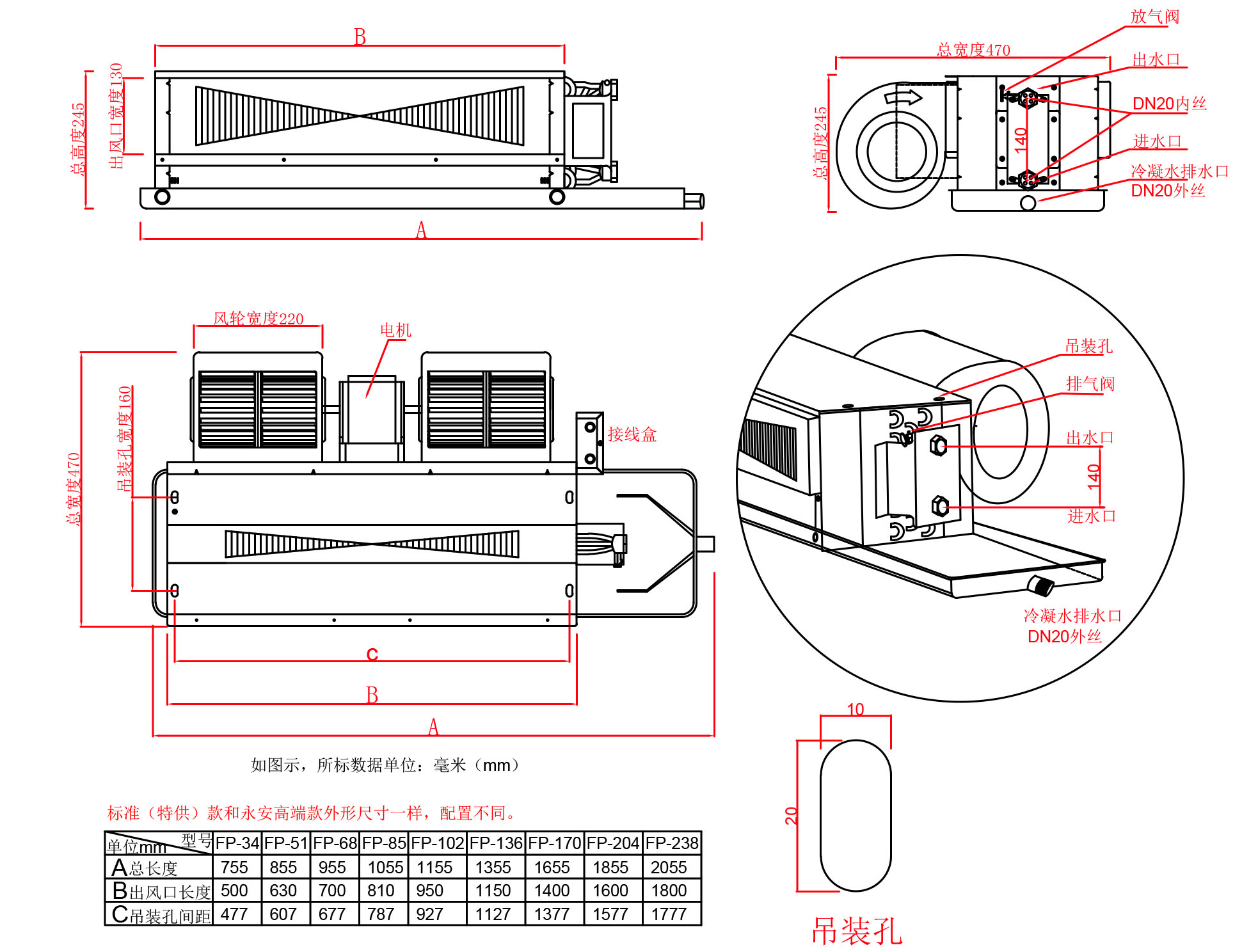 1.A是指風(fēng)機(jī)盤管整體的長(zhǎng)度(含接水盤,但不含排水孔);